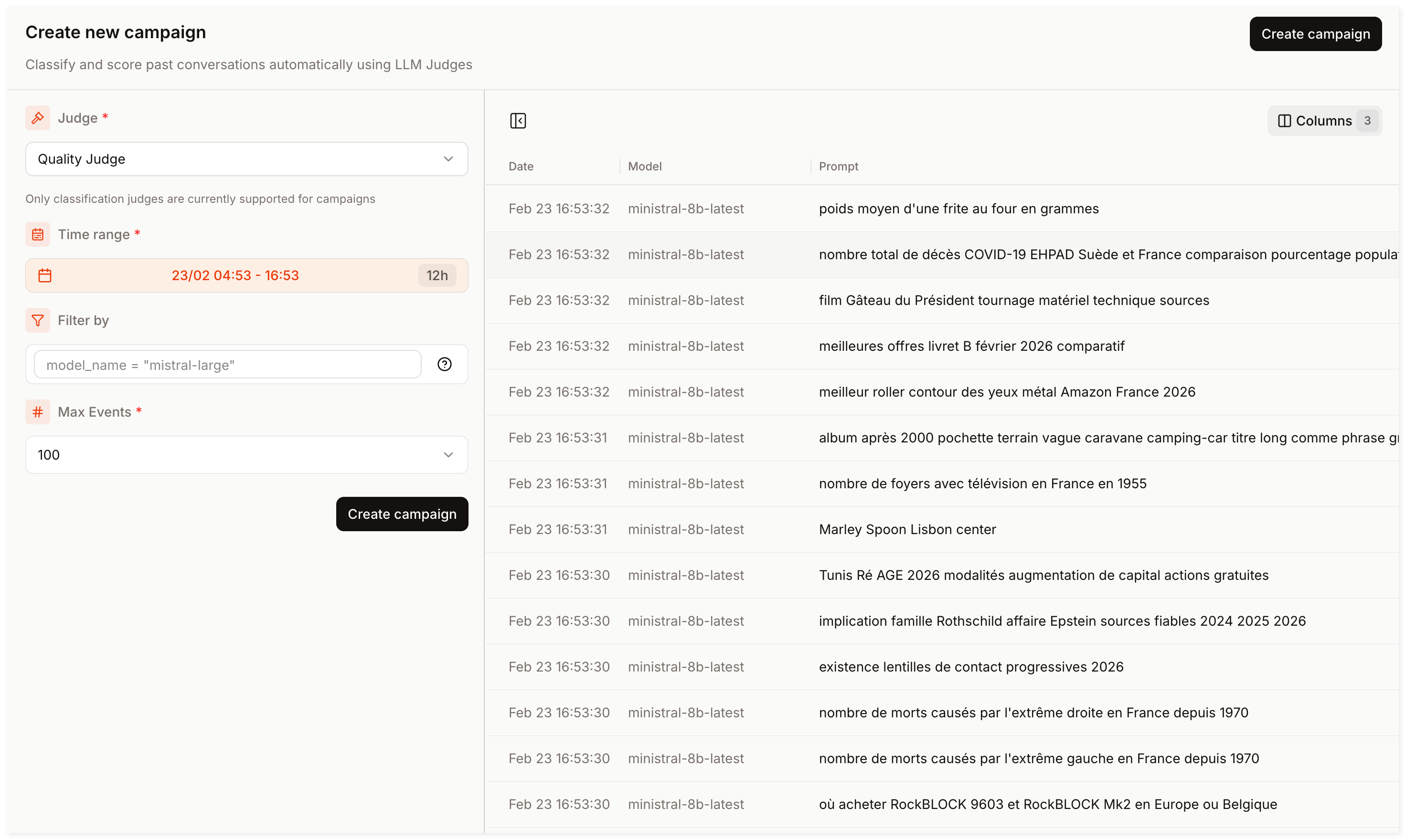 A Campaign evaluates a set of filtered events and applies your Judge to them. To run a Campaign: