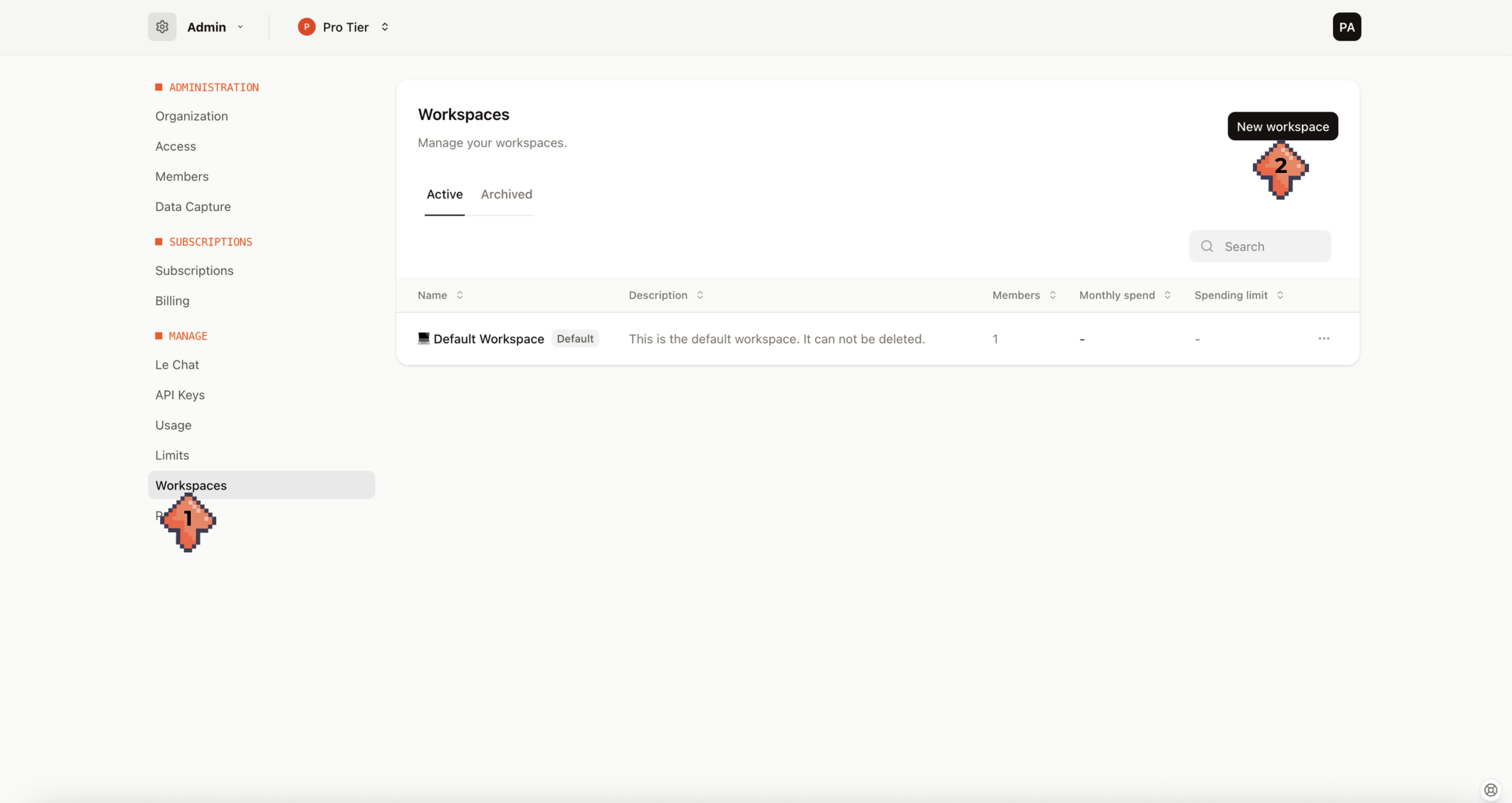 A Mistral AI Studio Workspace is a group of accounts within the same organization, each with specific rights and permissions. Creating a workspace for your team allows you to: