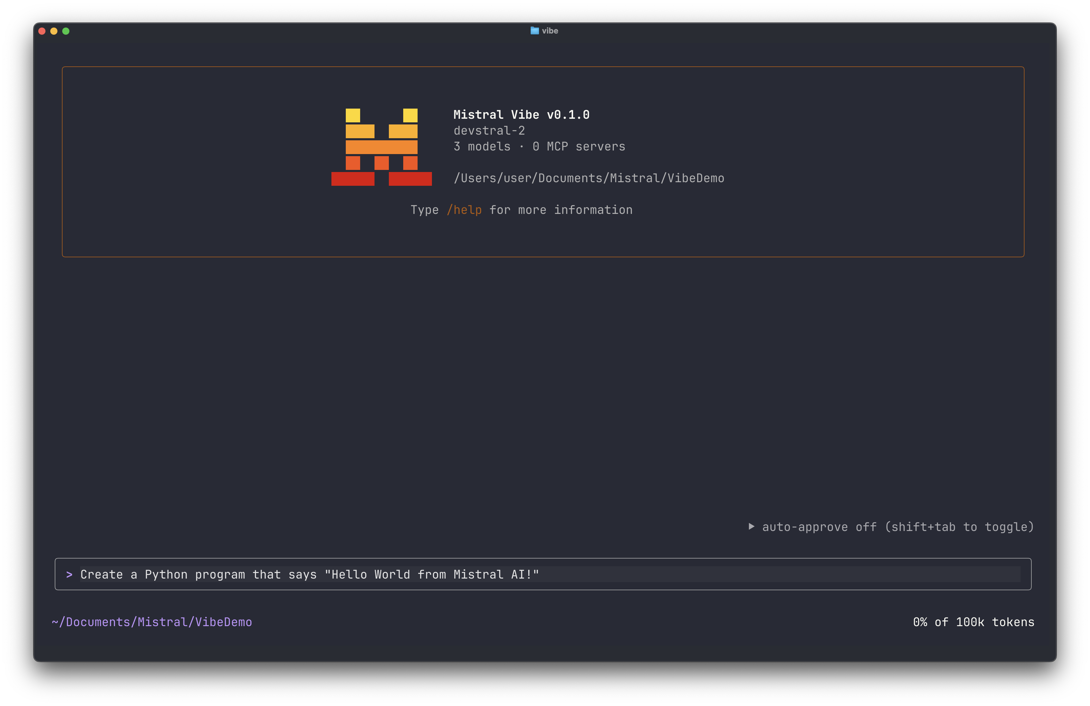 Type a request directly into the Mistral Vibe prompt. For example: