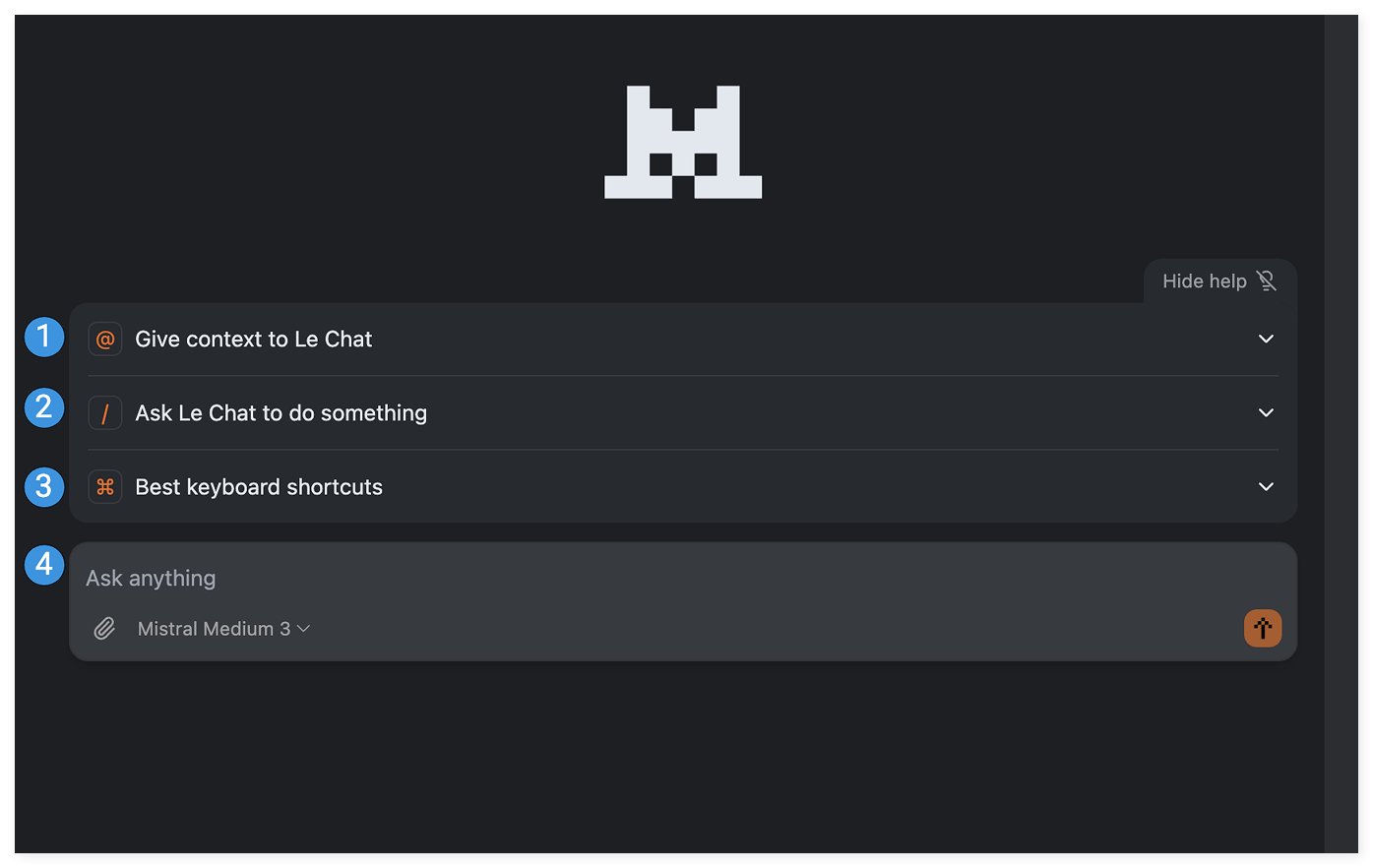 The chat interface is where you interact with Le Chat, your AI assistant. Type a message, press Enter ↵, and Le Chat responds immediately.