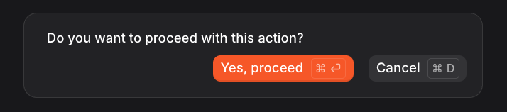 AcceptDeclineConfirmation is a specialized confirmation with two options: accept and decline. Clients can render this as a standard validation UI with keyboard shortcuts for quick responses: