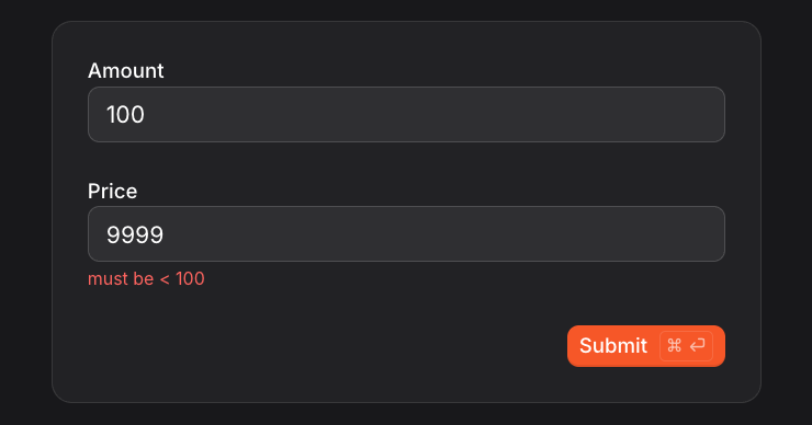 NumberField | Numeric input | description, minimum, maximum, exclusive_minimum, exclusive_maximum, prefilled_value |